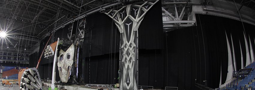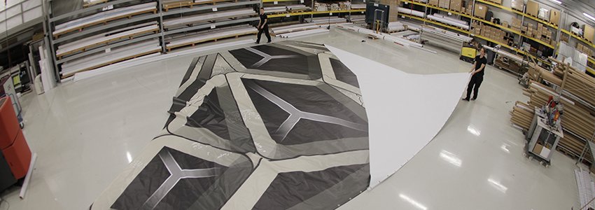 Aan beide zijden van het podium werden twee prachtige megabanners gemonteerd. De trapezium-vormige-banners zijn 25 meter hoog waarvan de top 19 meter breed. De visuals zijn full colour geprint op B1 brandvertragend frontlit materiaal, dat perfect geschikt is in de evenementenbranche. Met onze VUTEk GSR 5000r kunnen wij 5 meter breed roll to roll printen. De verschillende delen zijn aan elkaar gelast en voorzien van verstevigende zoom, zeilringen, klittenband en enkele gaten om de licht- en geluidsinstallatie in te verwerken. Bekijk hier de video van het productieproces en eindresultaat: